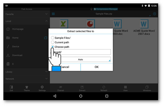 Si apre automaticamente il menù Gestore di compressione, che mostra i file zip presenti. Premete su un file da estrarre finché non risulta evidenziato.