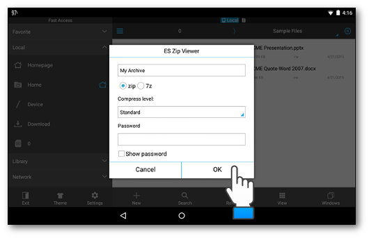 Vedrete comparire la finestra di dialogo di “ES Zip Viewer” con tanto di tastiera, per scrivere il nome con cui salvare e convertire i vostri file in formato ZIP. Dopo averlo scritto, se non riuscite a vedere tutta la finestra, premete la freccina in giù che appare sotto la tastiera.