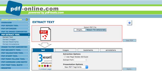 ExtractPDF è un sito creato appositamente per l’estrazione di dati da PDF, in particolare con questa risorsa è possibile estrarre immagini, estrarre font ed estrarre porzioni di testo. È uno strumento abbastanza completo ma presenta una limitazione sulla dimensione massima del file da caricare che può essere al massimo di 14 MB. Per estrarre le nostre immagini con ExtractPDF bisogna seguire quanto segue: