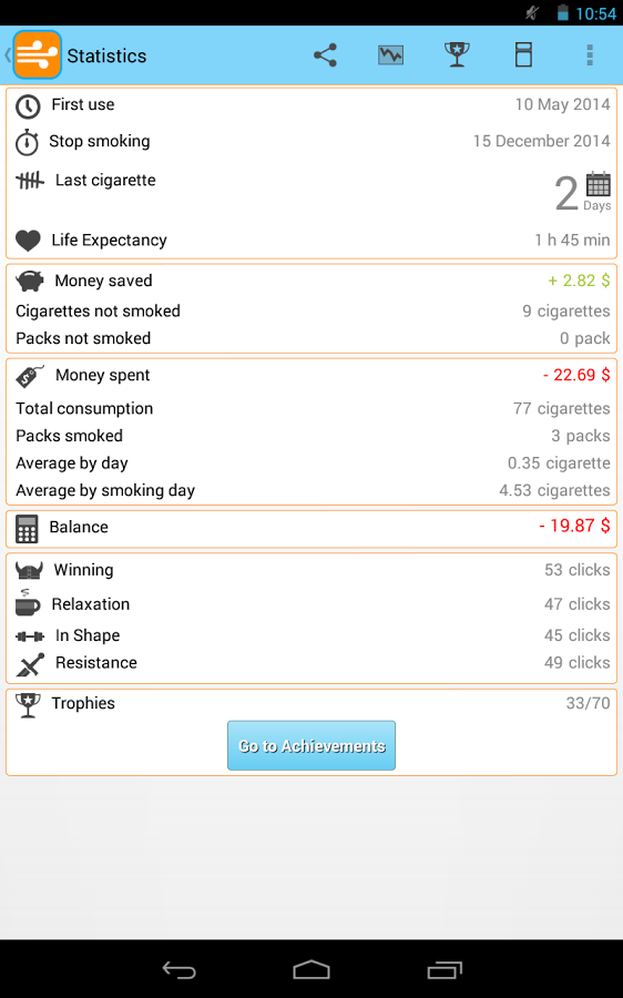 Quit Smoking è un’app che contiene al suo interno tutte le caratteristiche viste in precedenza: vi permette di sapere quanti soldi state risparmiando, da quanto tempo non fumate una sigaretta ed il numero di sigarette che avete evitato. Ma rende l’operazione decisamente più divertente: ogni tot sigarette risparmiate, oppure in base al tempo da “sobri”, Quit Smoking sbloccherà un premio motivazionale per voi. Pur non essendo tantissimi, sono davvero utili e divertenti: ad esempio, dopo aver risparmiato 20 dollari l’App vi comunicherà che, con quella cifra, potrete portare la vostra ragazza a cena fuori. Una volta che vi farete coinvolgere dal gioco, sarà davvero divertente conoscere i prossimi obiettivi da sbloccare.