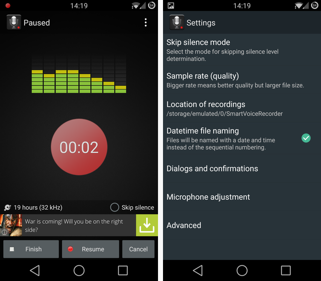 Skyro permette di fare lo stesso ma con una grafica migliore, e anche di aggiungere tag e posizione geografica. La grafica segue i dettami del material design di Google ma non è solo una questione estetica: registrare appunti vocali, conferenze, lezioni e memo con Skyro è davvero semplice, e permette di avere sotto controllo ogni aspetto della registrazione. Inoltre salva automaticamente la registrazione ogni minuto, evitando il rischio di perdere il tutto se finisce la batteria o se per qualche motivo il telefono si dovesse spegnere o bloccare.